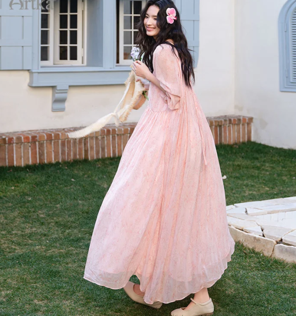 Romantic Pink Floral Printed Lantern Sleeves Dress