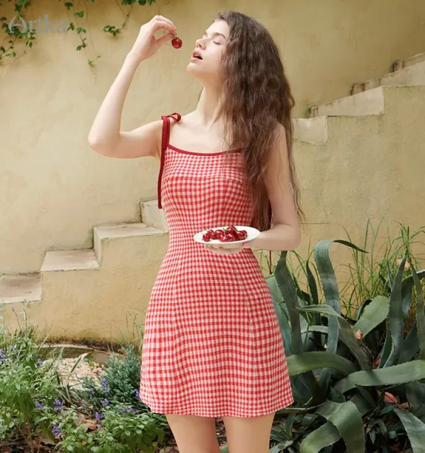 Vintage Plaid Summer Dress – High Waist, Spaghetti Strap