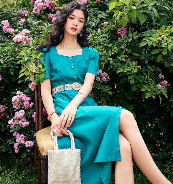 Vintage Single Breasted Dress With Puff Sleeves And Belt
