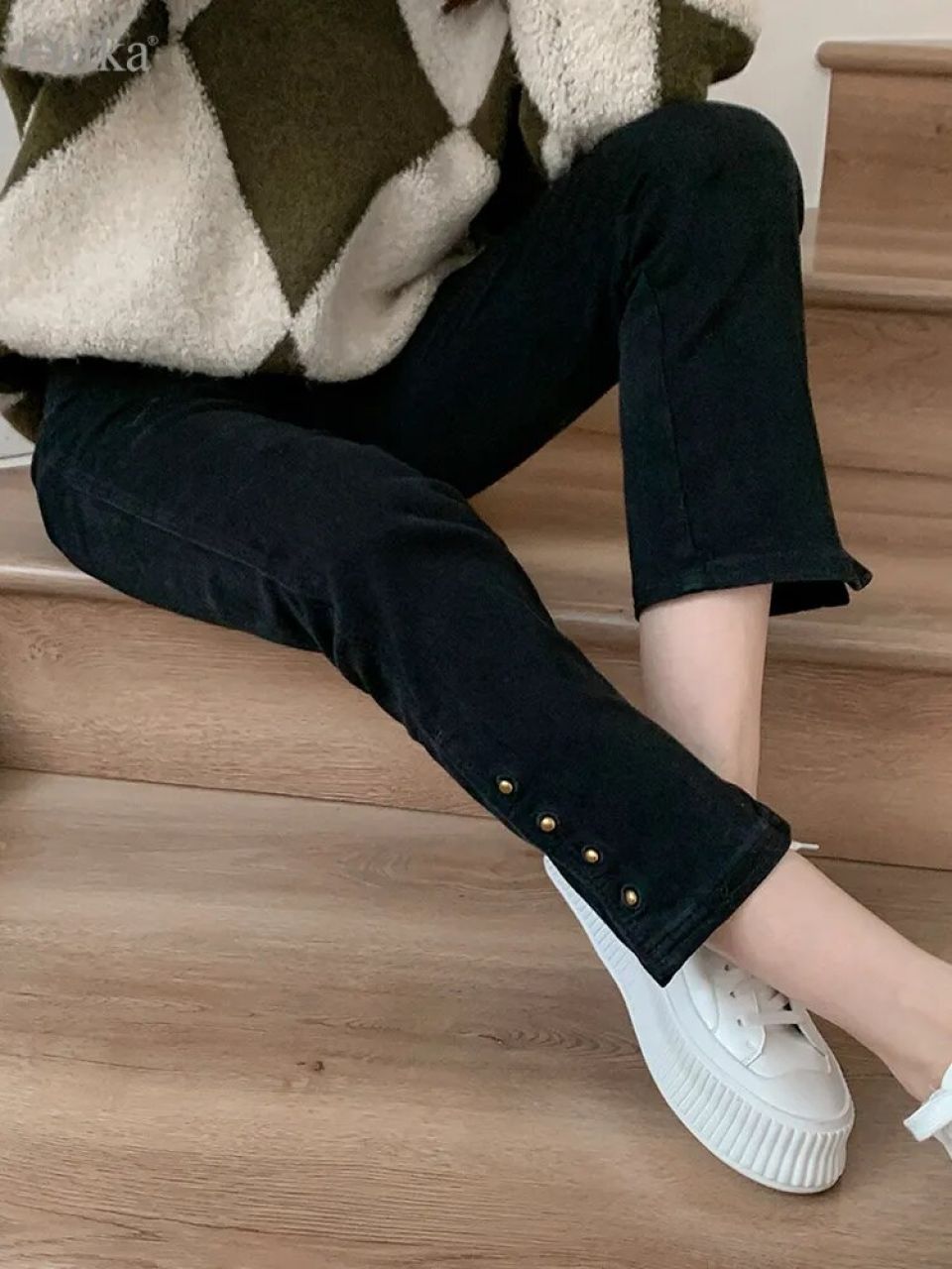 With a design that features a chic split at the ankles, these jeans are for those who dare to stand out. The split denim style is not just trendy; it provides a glimpse of your footwear, allowing you to showcase your favorite shoes with flair.