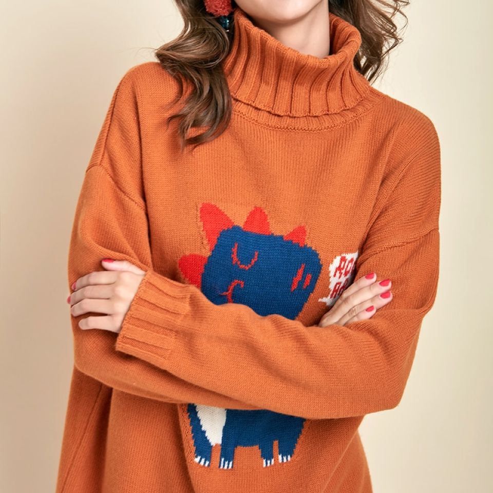 Elevate your wardrobe with our Cartoon Embroidery Loose Fit Turtleneck, a blend of artistic flair and cozy comfort.
