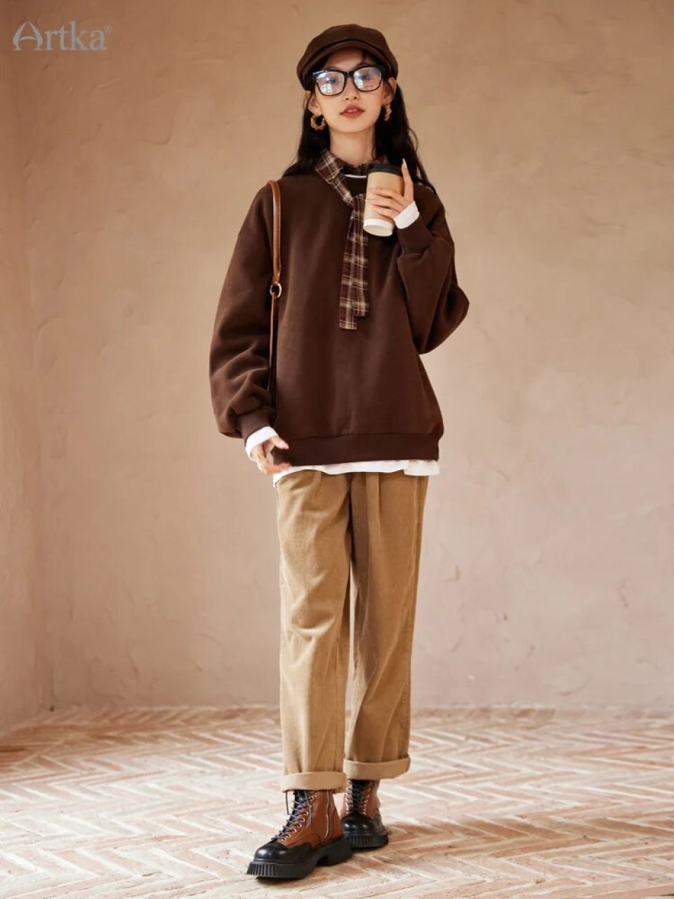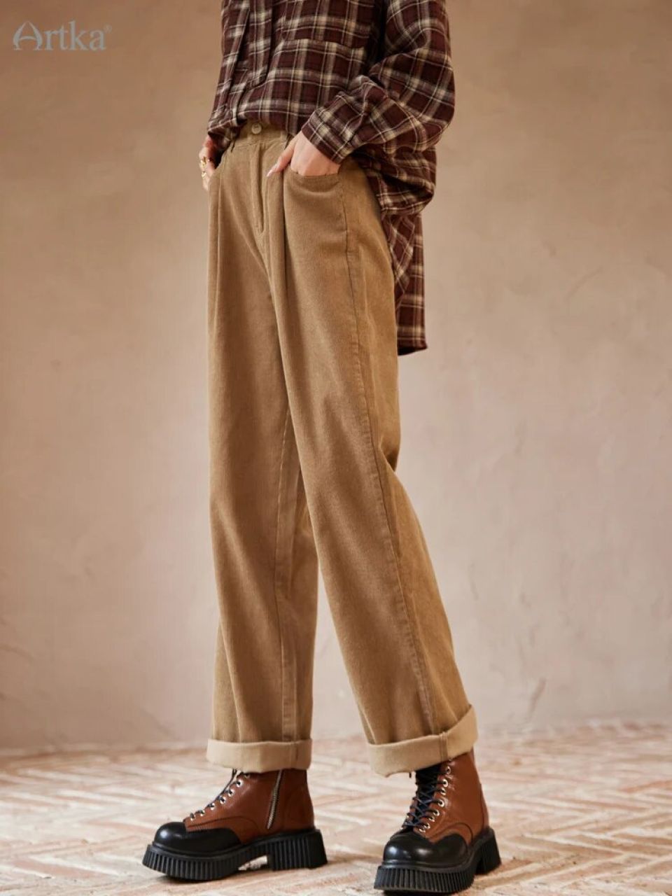 ARTKA 2022 Autumn Winter New Women Pants are your next wardrobe staple, radiating casual elegance with a touch of simplicity. These high-waist trousers are meticulously crafted from premium cotton corduroy, offering a soft, comfortable feel against your skin while providing sufficient warmth during the chilly seasons. The solid pattern performs as a blank canvas, inviting you to express your unique style and personality through various tops and accessories.