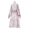 Приталенное платье в винтажном стиле собрано в талии, а дизайн оборок придает изделию оригинальность. Шнуровка дополнена кисточками-подвесками, которые еще более подчеркивают ощущение винтажа.Просвечивающая ткань дополнена белой подкладкой, создано гармоничное объединение прозрачности и элегантности.