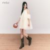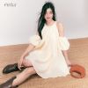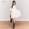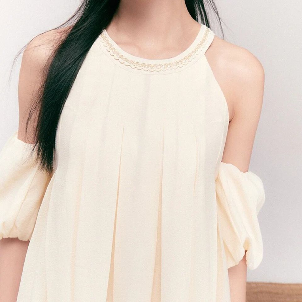 The unique off-shoulder puff sleeve design captures attention effortlessly. As the soft, solid pattern flows over the dress, it culminates in an A-line silhouette that's universally flattering. The halter neckline adds an element of seduction while remaining refined, making it perfect for any occasion – from day outings to intimate evening events.