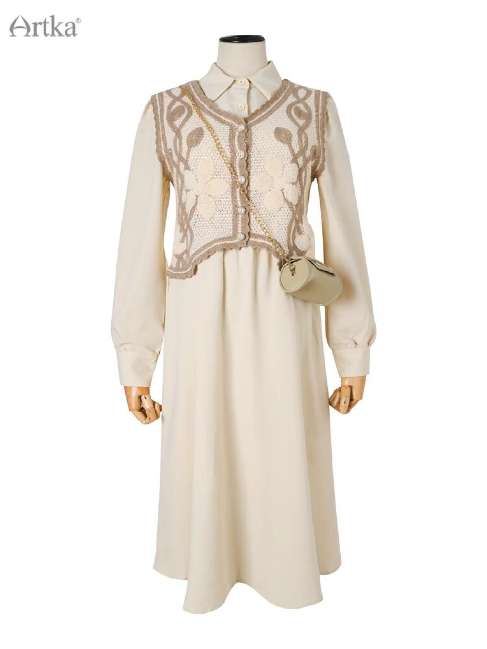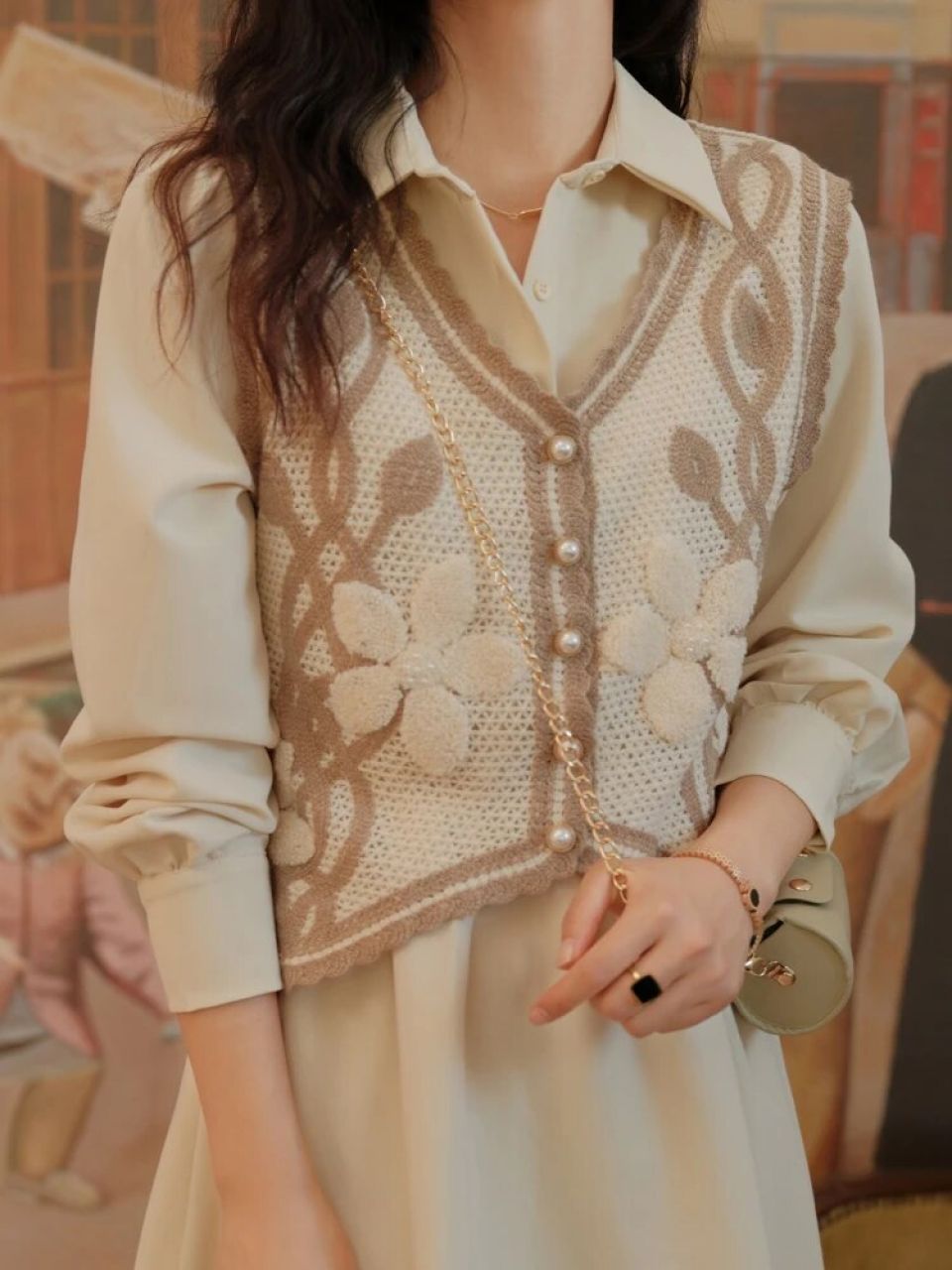 Complete your look with the V-neck knitted embroidery vest, a versatile layering piece that adds depth to your outfit. Whether you choose to wear it over the dress or with other wardrobe staples, this vest is a game-changer.