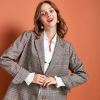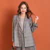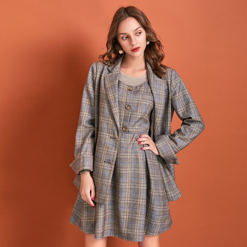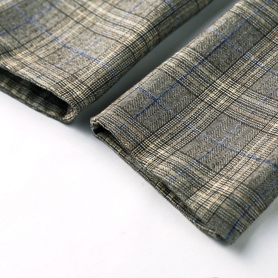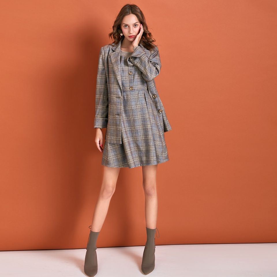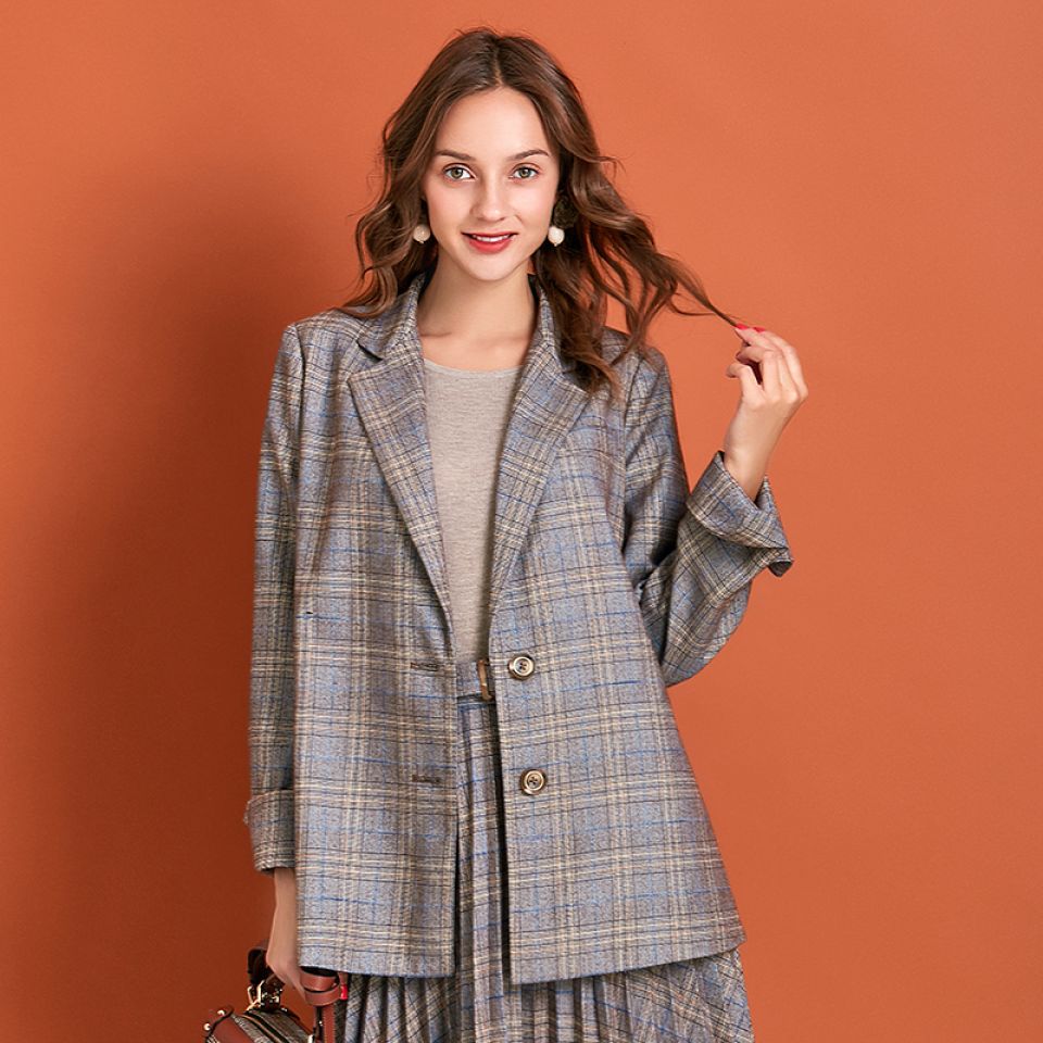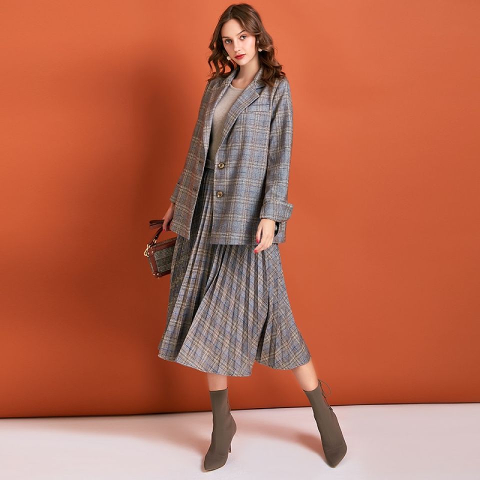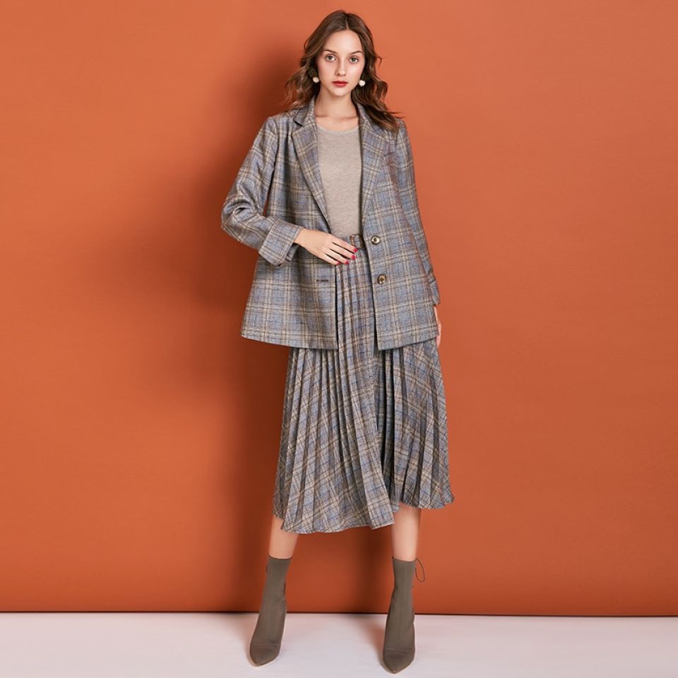 This sophisticated co-ord set features a single-breasted blazer crafted from premium plaid fabric, offering a tailored fit that enhances your silhouette. Paired with a matching pleated midi skirt, this ensemble is both chic and comfortable, perfect for any occasion.