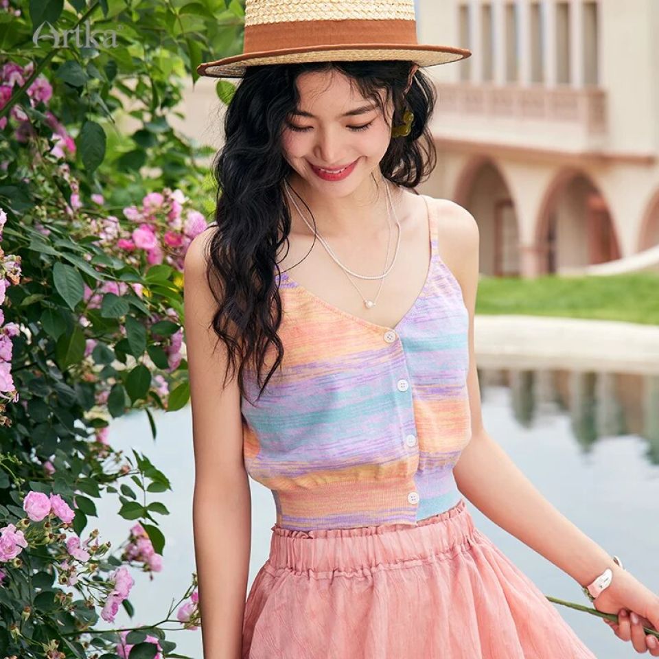 The ARTKA New Women Tops uniquely blend contemporary fashion elements with classic designs. The combination of a sultry V-neck with the finesse of colourful stripes makes this camisole an epitome of style and comfort for every modern woman.