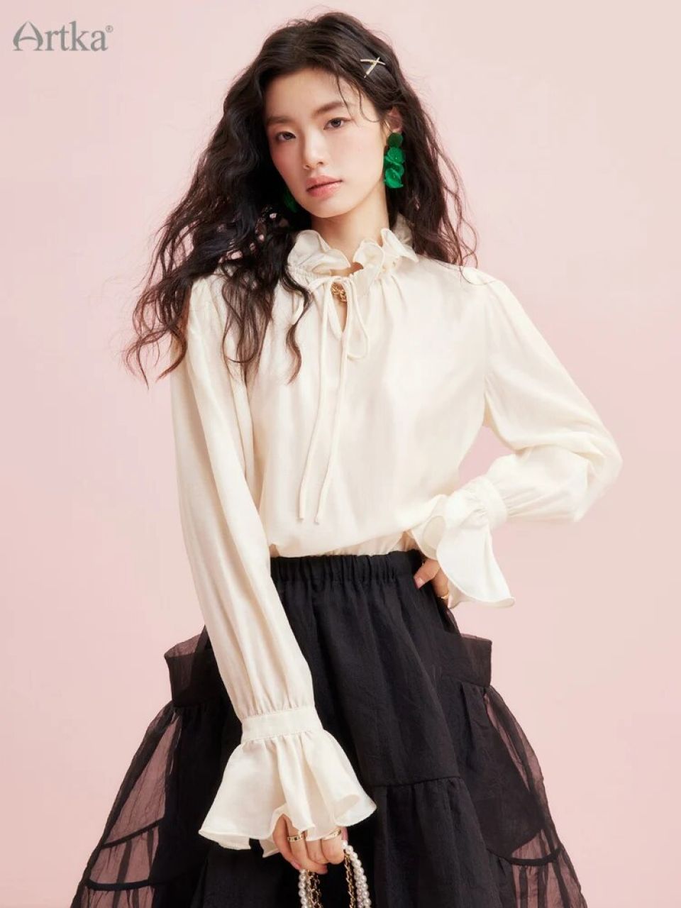 The ARTKA Victorian Style Flared Sleeves Blouse is not just any shirt—it’s a gateway to the streets of Paris, capturing the very essence of French elegance. Every stitch, fold, and pattern has been meticulously crafted to exude an aura of sophistication and timelessness. This blouse is not just clothing—it’s an experience, an ode to the Palace style that has defined French fashion for generations. 1. Delicate Details, Bold Statement Dive deep into the world of delicate details with this blouse’s exquisite ruffle stand collar and lace-up design. Paired with its flare sleeves, the shirt marries modern aesthetics with age-old Parisian charm. The ruffles, a symbol of luxury and finesse, adorn the collar and make a powerful statement. 2. Supreme Comfort with Every Wear While its appearance speaks elegance and charm, Victorian Style Flared Sleeves Blouse’s fabric silently promises unmatched comfort. Crafted with the finest chiffon and a blend of acetate and polyester, this blouse offers a slight stretch—ensuring it fits perfectly while offering room for movement. Its midweight thickness ensures it drapes beautifully without being too heavy, perfect for spring and summer afternoons. 3. Fit For Every Occasion With its loose fit, this blouse looks elegant and versatile. Whether it’s a day at the office, an evening dinner, or a casual outing with friends, the ARTKA Victorian Style Flared Sleeves Blouse adapts to every occasion. Its pullover dress pattern ensures ease of wear, while the full-length flare sleeves add a touch of drama, making you stand out in any crowd. 4. A Heritage of Quality Behind every ARTKA blouse lies the brand’s commitment to unparalleled quality and craftsmanship. This blouse isn’t just a piece of clothing—it’s a legacy, a testament to ARTKA’s dedication to bringing the best of fashion to women everywhere.1. Please note that the manual measurement will have an error of 2-4cm. hope you understand. 2. The color of the clothes may differ from the original primary colors due to lighting or display, etc. The color of the items is subject to the actual product.
