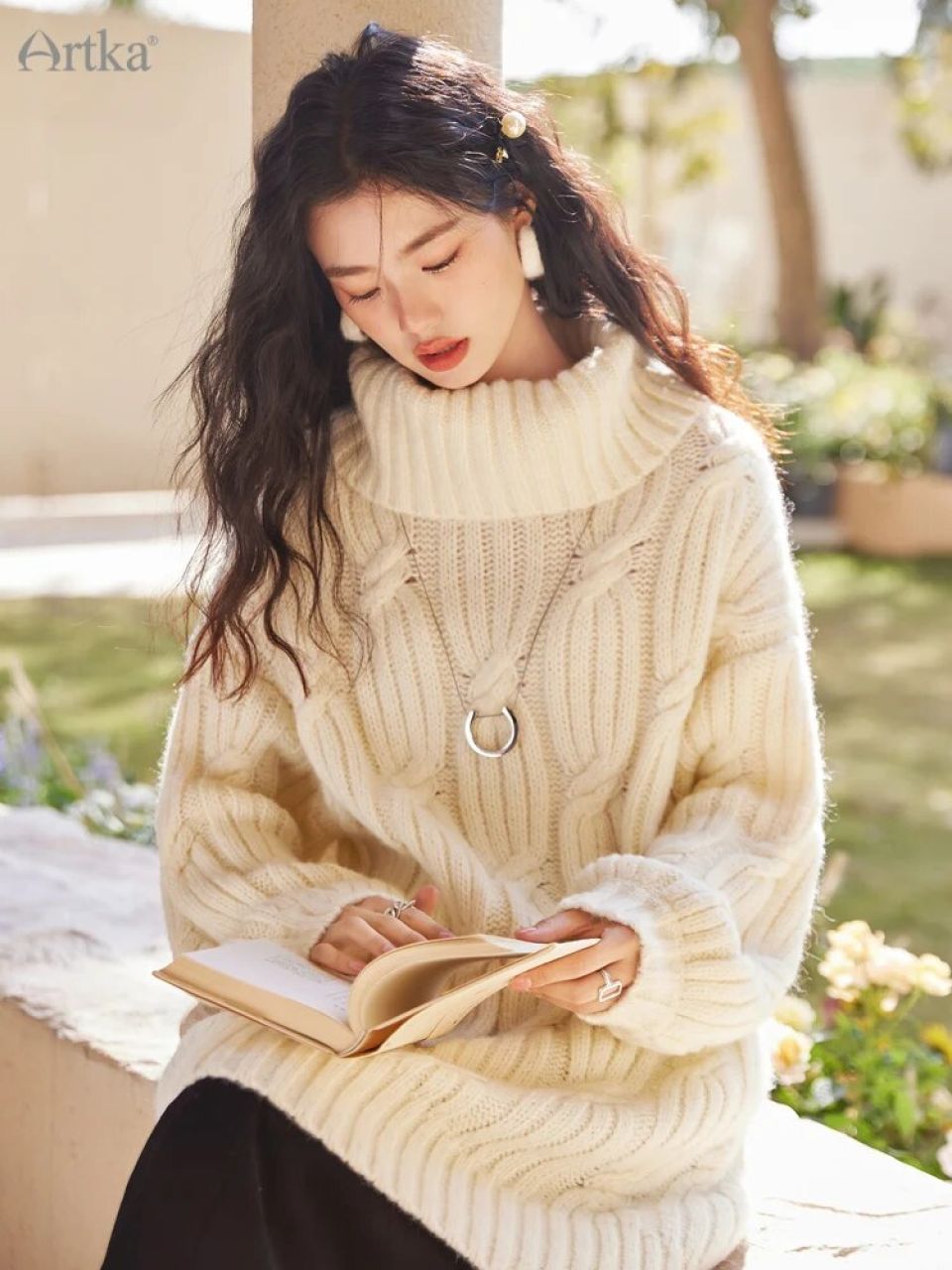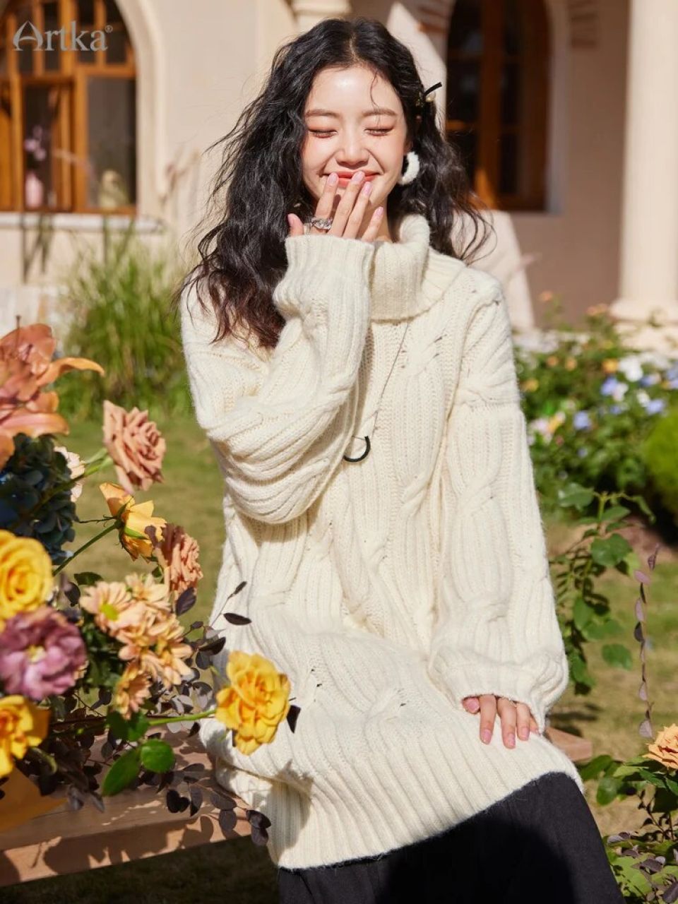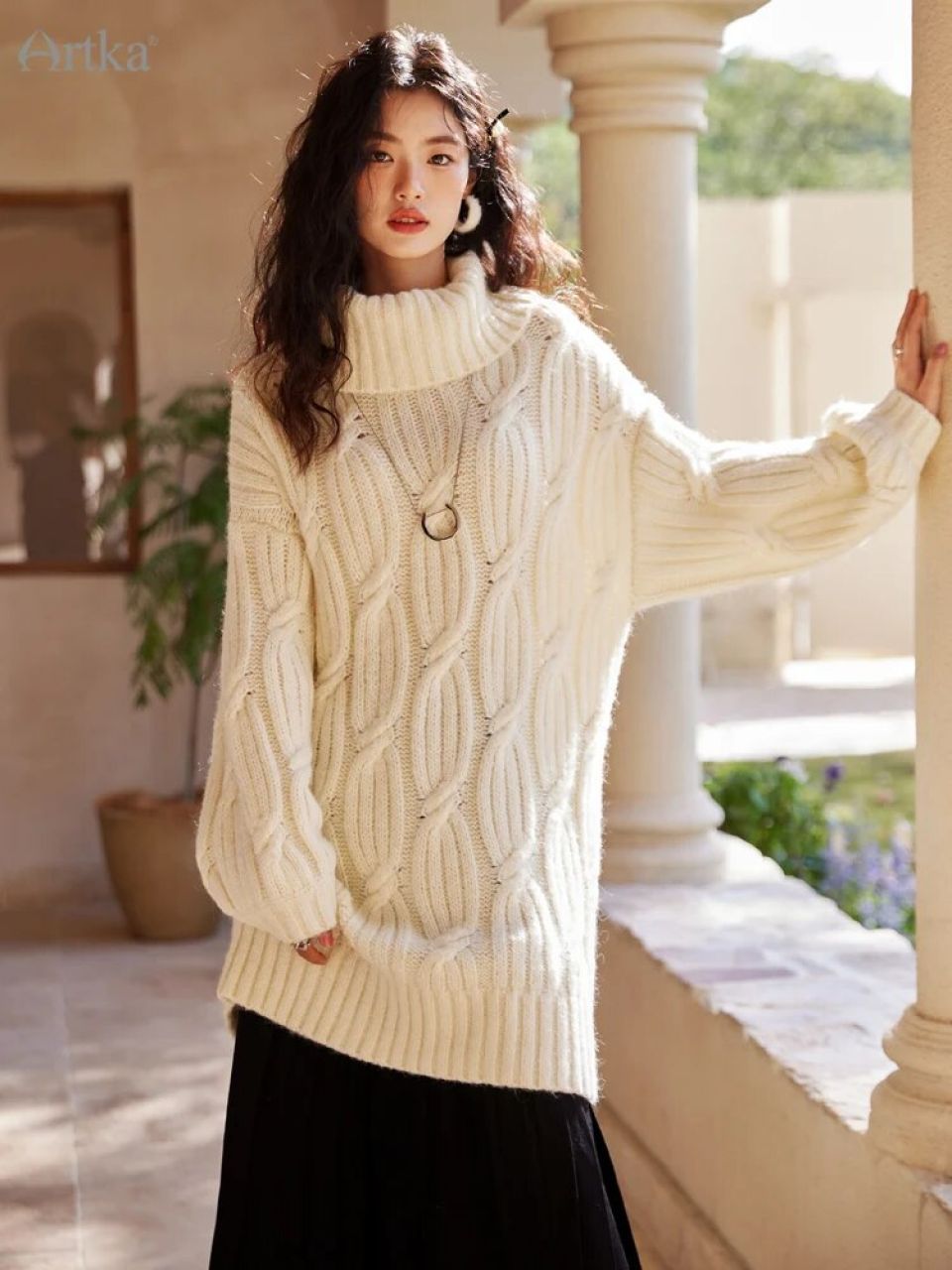 The ARTKA sweater dress features a sophisticated turtleneck design, offering not just warmth but also a style that is timeless and elegant. The turtleneck acts as a cozy, stylish collar that frames your face beautifully, creating a look equally suitable for office wear or a casual day out in the winter. Its full sleeves provide additional warmth, enveloping a gentle embrace during the colder days.